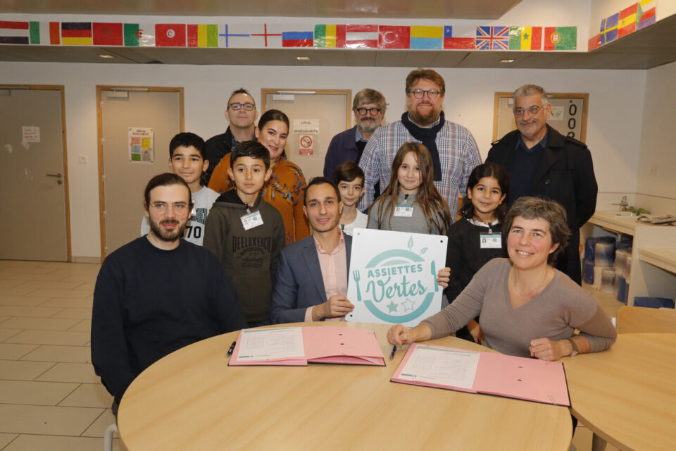 A midi, Marie MASSART, Présidente du MIN de Montpellier, Adjointe au Maire de Montpellier, Déléguée à la Politique alimentaire et à l’Agriculture urbaine, Eddine ARIZTEGUI, Adjoint au Maire de Montpellier, Délégué au bien-être animal, aux côtés de Cyril ERNST, chargé de développement de l’association Assiettes végétales et Marine FAHY, chargée de campagne de l’association Assiettes végétales, ont signé la charte du label « Assiettes vertes » en présence de la directrice, des personnels et des éco-délégués de l’école Germaine Richier, quartier Ovalie. La Ville de Montpellier est ainsi récompensée pour son action exemplaire en faveur des alternatives végétales proposées au sein de ses 90 restaurants scolaires.